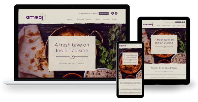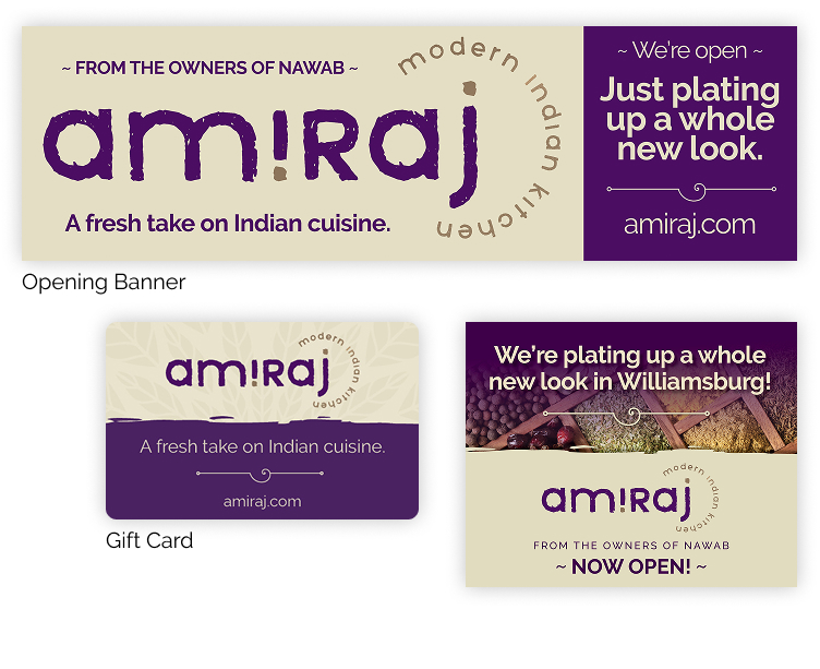 The tagline “A fresh take on Indian cuisine” became the heartbeat of the brand. From signage and gift cards to advertising and a fully responsive website, every touchpoint reinforced Amiraj’s bold, modern take on Indian food.